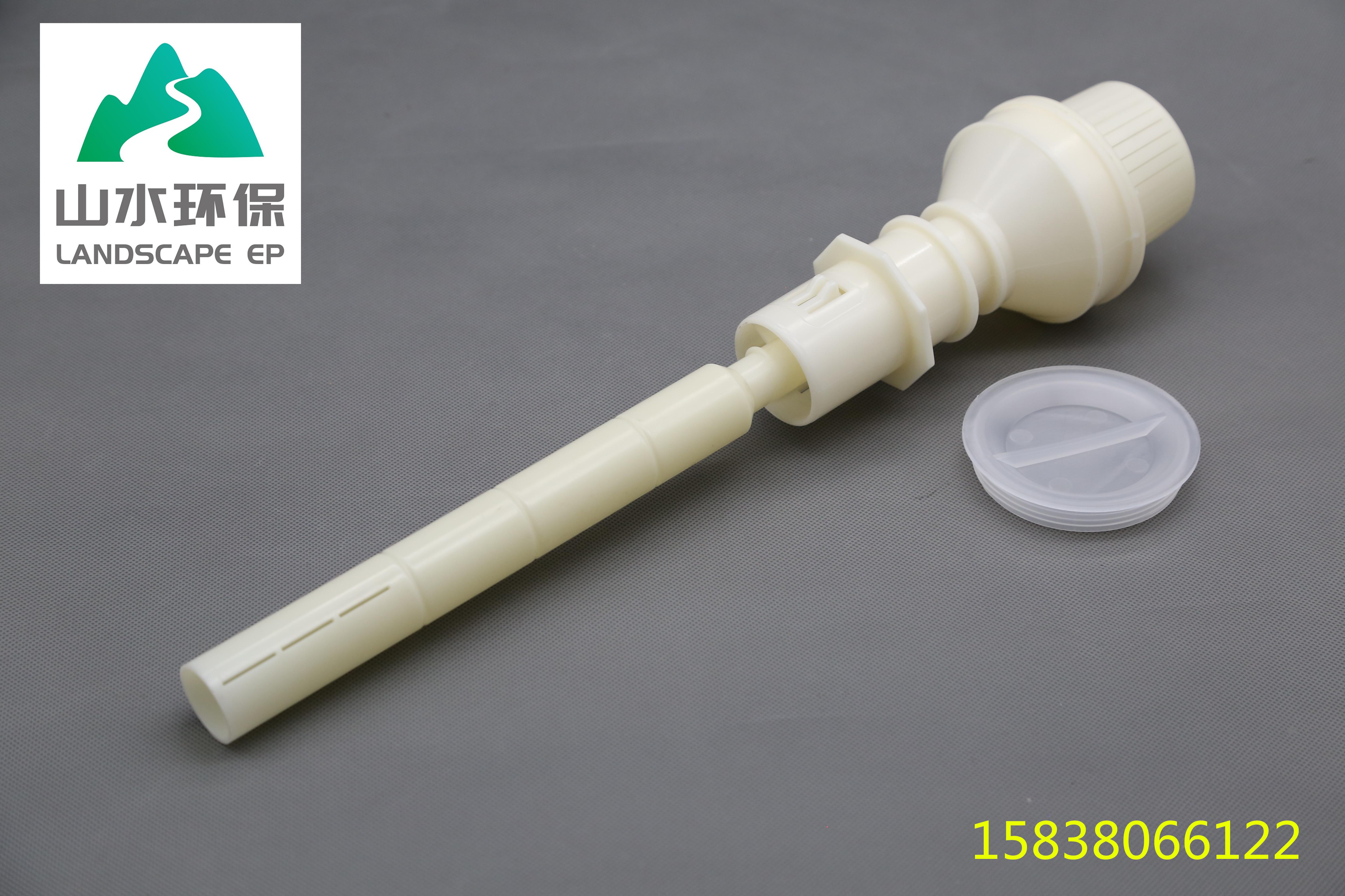 可調(diào)式長柄濾頭是一 種由濾桿、預(yù)埋件、和濾帽組成的可調(diào)節(jié)性長柄氣、水反沖濾頭,其特征在于濾桿是通過它上面的外螺紋和預(yù)埋件上的內(nèi)螺紋,使它與預(yù)埋件相連接,其濾桿與預(yù)埋件之間的相對(duì)位置可調(diào),另外在預(yù)埋件下部的外柱面上設(shè)置有4~8條具有彈性呈斜面狀的倒鉤,在預(yù)埋件上部的圓周邊端面上開有鋸齒形的斜齒,濾帽也是通螺紋與預(yù)埋件的上部相連,同時(shí)在濾帽中間圓盤的下端面也開有鋸齒形的斜齒,其斜齒的方向與預(yù)埋件上的斜齒方向相反。