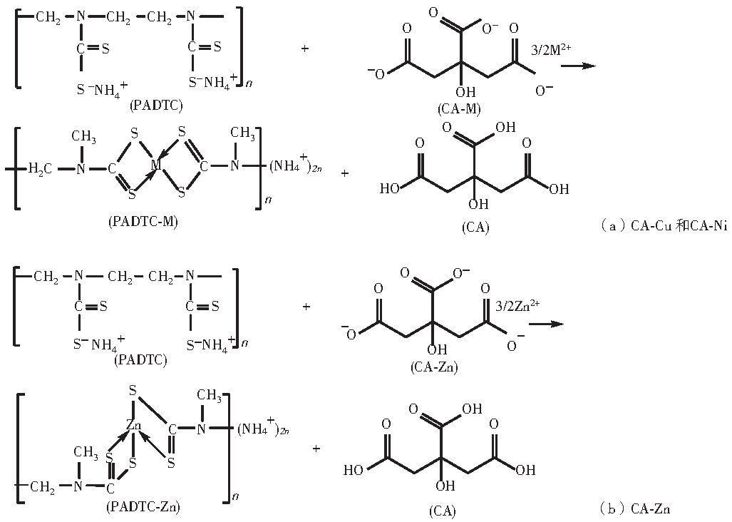 以絡(luò)合劑CA為例,PADTC抓捕重金屬的機(jī)理如圖5所示(其中M 代表Cu 或者Ni)。銅原子的原子序數(shù)為29,其失去3d軌道和4s軌道的2個(gè)電子后形成銅離子,銅離子在與PADTC形成配合物時(shí),采取dsp2雜化軌道成鍵,構(gòu)型為平面四方形結(jié)構(gòu),中心離子銅的配位數(shù)為4,機(jī)理如圖5(a)所示。Ni的電子結(jié)構(gòu)為3d84s2,失去4s軌道上的2個(gè)電子后形成鎳離子。當(dāng)PADTC抓捕鎳離子時(shí),鎳離子的8個(gè)3d電子發(fā)生重排,空出一個(gè)d軌道與4s和4p軌道雜交成dsp2軌道。雜化軌道為平面四方形結(jié)構(gòu),所以PADTC-Ni 是平面正方形。反應(yīng)抓捕機(jī)理和銅類(lèi)似,也是形成平面正方形,如圖5(a)所示。Zn 的電子結(jié)構(gòu)為3d104s2,失去4s軌道上的2個(gè)電子形成鋅離子。當(dāng)與PADTC反應(yīng)時(shí),鋅離子的3d軌道是飽和的,因此,形成sp3 軌道,構(gòu)型為正四面體結(jié)構(gòu),中心離子的配位數(shù)也為4,抓捕機(jī)理如圖5(b)所示。