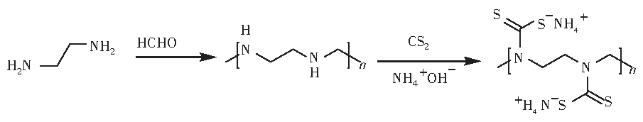 制備PADTC的基本反應(yīng)方程見(jiàn)式(1)。乙二胺和甲醛縮合形成聚合物,然后發(fā)生親核反應(yīng),在堿性條件下與二硫化碳形成聚-二硫代氨基甲酸銨鹽(PADTC)。