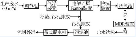 將原有調節池與缺氧池合并為新的調節池,在新調節池內設置鼓風曝氣系統,在充分調節水質水量的同時,保證油類及懸浮物等污染物不會上浮;出水經地上泵提升至氣浮裝置,在氣浮裝置內進行部分加壓溶氣氣浮預處理,去除廢水中大部分油類污染物、大量懸浮物SS等,以減少后續電解還原Fenton電極板清洗頻次,并降低后續處理負荷。氣浮裝置出水自流進入電解還原Fenton裝置,通過外加電場作用該廢水,由于該廢水中含Cl-質量濃度高、導電性良好,外加電場后,聯合化學藥劑共同作用,化學反應劇烈,可對廢水中大分子有機污染物進行氧化分解;電解還原Fenton裝置出水自流進入快沉裝置,通過調節pH使大量污泥沉淀;快沉裝置上清液自流進入厭氧池,通過厭氧微生物的新陳代謝作用去除廢水中難降解的有機污染物;厭氧池出水經地上泵提升至MBR裝置,通過好氧微生物的作用進一步降解廢水中的有機污染物,同時利用MBR膜組件的截留功能維持MBR裝置內較高的污泥濃度,以增強系統的耐沖擊負荷能力;MBR裝置出水經出水泵抽至出水桶,達標后納管排放。